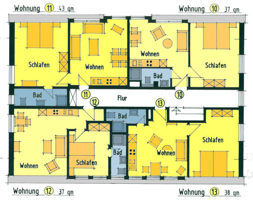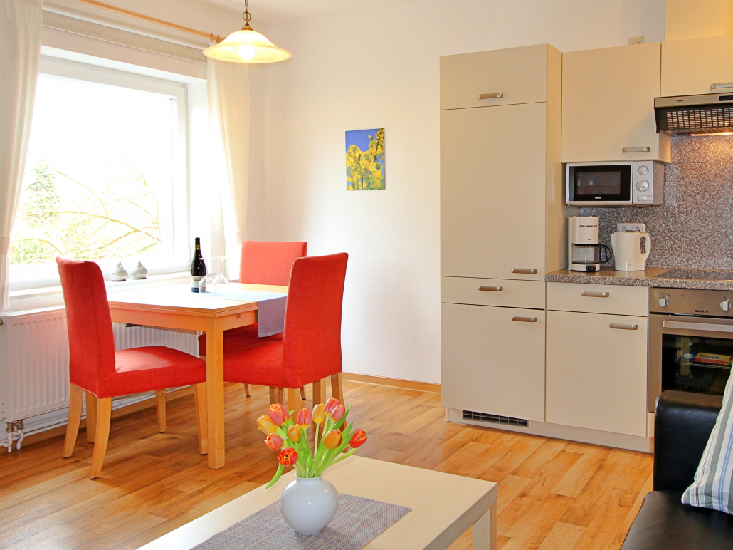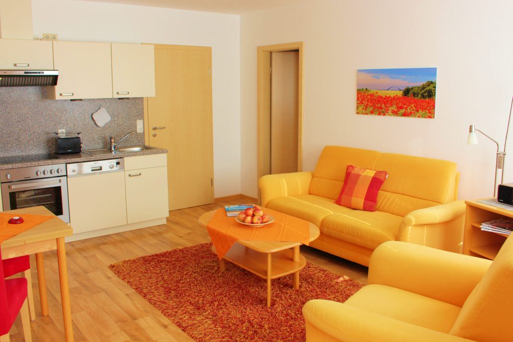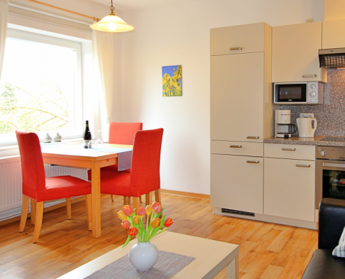 Die vier Ferienwohnungen bestehen jeweils aus Wohnraum mit Küchenzeile (mit Geschirrspüler, Mikrowelle & Backofen), Schlafzimmer und Dusche/WC und bieten Platz für je 2 Personen.
